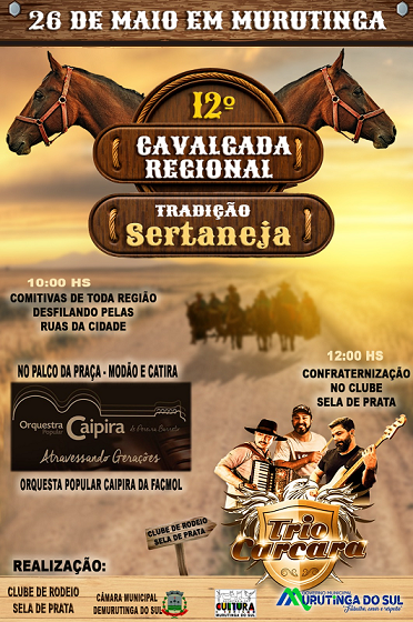 Também fazendo parte dos festejos dos 70 anos de Murutinga do Sul, a 12ª Cavalgada Regional Tradição Sertaneja acontece no próximo domingo, dia 26 de maio a partira das 10h. A concentração das Comitivas e a saída, será como no ano passado, nas proximidades da residência do senhor Adilson Caetano e passarão pelas principais ruas e avenidas da cidade.