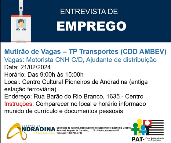 Posto de Atendimento ao Trabalhador de Andradina, ligado à Secretaria de Turismo, Desenvolvimento Econômico e Economia Criativa, informa a realização de dois mutirões do emprego esta semana. O primeiro está acontecendo nesta quarta-feira (21) n Centro Cultural Pioneiros de Andradina (Avenida Barão do Rio Branco, sem número, Centro), na captação de motoristas e auxiliares de distribuição para trabalhar na Ambev.