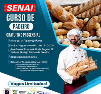 Assessoria de Comunicação A Prefeitura de Castilho, em parceria com o SENAI, está oferecendo um curso gratuito de padeiro para…
