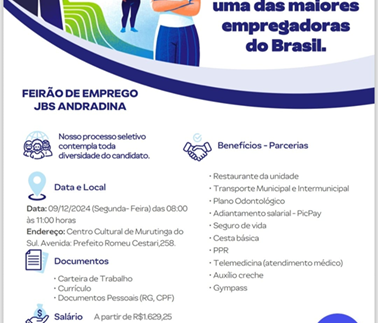 Assistência Social de Murutinga do Sul e JBS farão feirão de empregos na segunda