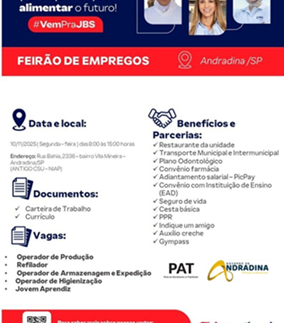 Assessoria de Comunicação A JBS realiza no próximo dia 10 de novembro, segunda-feira, um Feirão de Empregos em Andradina (SP), oferecendo diversas vagas para quem…