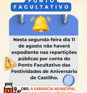Prefeitura de Castilho informa: Segunda-feira,11, será Ponto Facultativo
