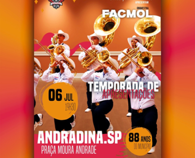 Assessoria de Comunicação A Orquestra de Sopros e Percussão FACMOL se apresenta em Andradina no mês de aniversário da cidade,…