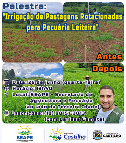 Marco Apolinário/JPN A SEAPE – Secretaria de Agricultura e Pecuária de Castilho abriu nesta quarta-feira (11) as inscrições para pecuaristas locais interessados no aprimoramento de suas técnicas na “Irrigação de…