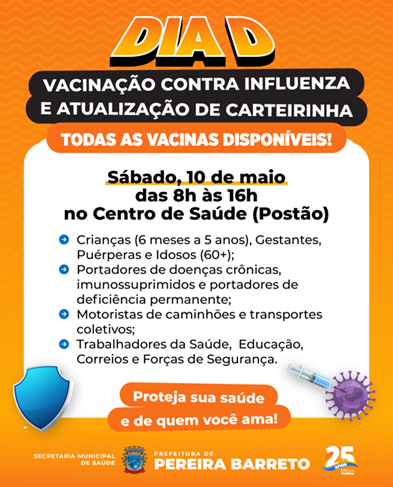Assessoria de Comunicação A Prefeitura de Andradina realiza neste sábado (10), uma grande mobilização no Dia D da Campanha de Vacinação contra a gripe. O compromisso é o de garantir…