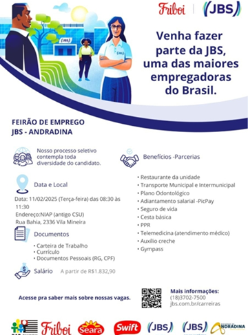 Assessoria de Comunicação Com vagas no setor de produção a unidade da JBS de Andradina está realizando um mutirão do emprego no próximo dia 11 de fevereiro (terça-feira), das 08:30h…