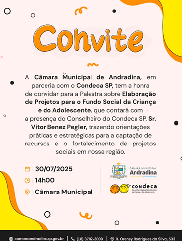 Assessoria de Comunicação A Câmara Municipal de Andradina, em parceria com o Condeca-SP (Conselho Estadual dos Direitos da Criança e do Adolescente), realiza no dia 30 de julho, às 14h,…