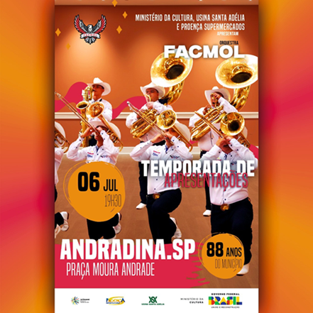 Assessoria de Comunicação A Orquestra de Sopros e Percussão FACMOL se apresenta em Andradina no mês de aniversário da cidade, como parte das celebrações pelos seus 88 anos. O concerto…