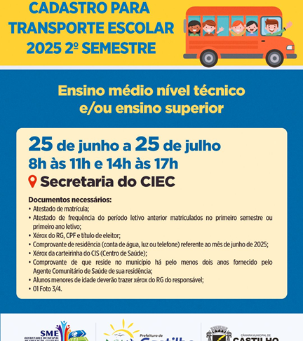 Assessoria de Comunicação A Secretaria Municipal de Educação, Cultura e Desporto de Castilho, liderada pela secretária Silvania Cintra, divulgou o período de cadastro e recadastramento do segundo semestre de 2025…