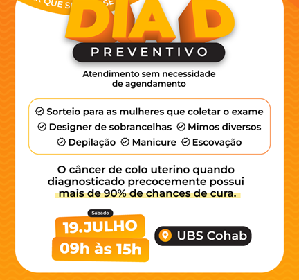 Assessoria de Comunicação A Unidade Básica de Saúde (UBS) COHAB realizará no próximo sábado, 19 de julho, o Dia D de Preventivo,…