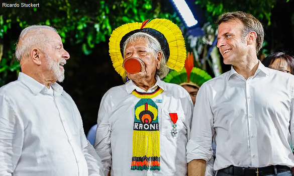 “Caro Raoni, esse momento é dedicado a você. Várias vezes você foi à França e eu me comprometi a vir aqui na sua floresta, estar junto com os seus. Essa floresta, que é tão cobiçada, mas que você sempre lutou para defendê-la durante décadas. O presidente Lula e eu, hoje, fazemos causa comum com um de nossos amigos”, disse Macron em discurso antes de entregar a medalha ao cacique.