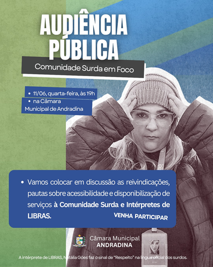 A Câmara Municipal de Andradina realiza na próxima quarta-feira (11), às 19h, uma audiência pública dedicada a ouvir as demandas da comunidade surda, seus familiares e intérpretes de Libras. A iniciativa é do vereador Hugo Zamboni (MDB) e foi recepcionada pelo presidente do Legislativo, Edgar Dourado (PSDB). Teve o apoio de todos os vereadores da casa.