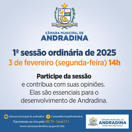 A Câmara Municipal de Andradina realiza nesta segunda-feira (3), às 14h, a primeira sessão ordinária do ano. Os trabalhos serão presididos pelo vereador Edgar Dourado (PSDB). Na pauta da sessão, estão quatro requerimentos de urgência especial. Se aprovados, os respectivos projetos serão incluídos imediatamente na ordem do dia para votação.