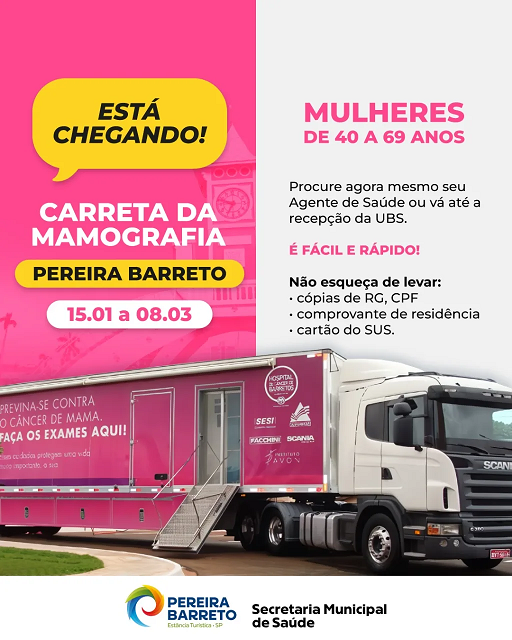 A Carreta do Hospital do Amor de Barretos chegará em Pereira Barreto na próxima segunda-feira (15). Ela ficará na Praça da Bandeira até o dia 8 de março para realização de exames preventivos e de mamografia. As mulheres, com idade entre 40 e 69 anos, que ainda não fizeram seu agendamento, precisam procurar seu agente de saúde ou a recepção de sua UBS com xérox do RG, CPF, comprovante de residência e cartão do SUS.
