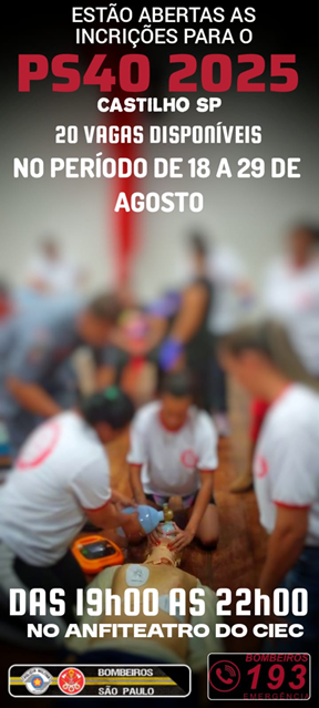 Encontra-se abertas as inscrições para o Treinamento de Pronto Socorrismo I/25, com carga de 40 horas/aula que será ministrada pela Base de Bombeiros de Castilho, no espaço do CIEC (Centro Integrado de Ensino e Cultura), no período de 18 a 29 de agosto de 2025, de segunda a sexta feira, das 19h às 22h10 horas. O Treinamento é voltado à comunidade em geral, independentemente de qualquer conhecimento prévio na área de saúde, e tem por objetivo proporcionar conhecimentos básicos de atendimento pré-hospitalar, buscando difundir uma cultura prevencionista, assim, ministrando aulas de manobras de reanimação cardiopulmonar (RCP), imobilização em casos de fraturas, atuação em engasgamentos entre outros.