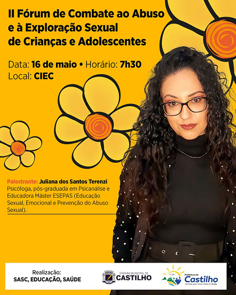 A partir das 07h30, eles estarão reunidos pelo segundo ano consecutivo para discutir o assunto que é o tema central das ações de conscientização realizadas em todo o país durante o Maio Laranja. O ponto alto deste Fórum será a presença da palestrante Juliana dos Santos Terenzi, uma psicóloga com pós graduação em Psicanálise e que também é Educadora Máster ESEPAS (Educação Sexual, Emocional e Prevenção do Abuso Sexual).