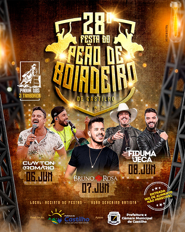 No próximo mês o prefeito Paulo Duarte Boaventura realizará a 28ª Festa do Peão de Rodeio. Serão três noites, entre 06 e 08 de junho, com montarias em touros, prova dos três tambores e shows musicais. A entrada será um quilo de alimento não perecível (Não serão aceitos sal, fubá e nem alimentos vencidos).