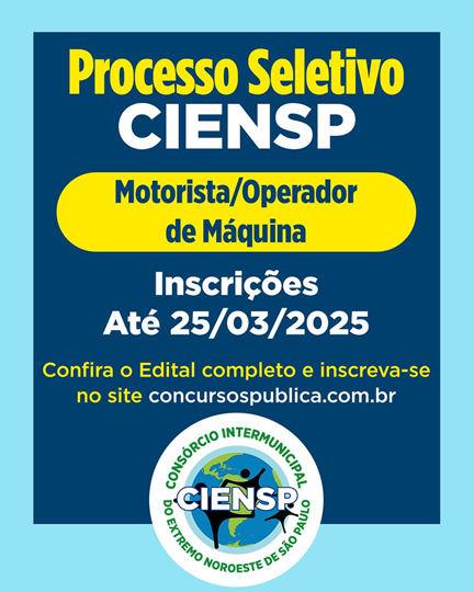 O CIENSP (Consórcio do Extremo Noroeste do Estado de São Paulo) está com inscrições abertas para o processo seletivo de Motorista/Operador de Máquina. O prazo para as inscrições são até dia 25 de marco de 2025, exclusivamente pelo site www.concursospublica.com.br. O salário é de R$ 3.500,00 para jornada de 44h semanais.