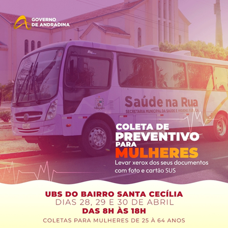 Nos dias 28, 29 e 30 de abril, acontece coleta de exames preventivos na UBS do bairro Benfica. O ônibus da saúde estará disponível das 8h às 18h para mulheres de 25 à 64 anos. Importante levar xerox dos seus documentos com fotos e o cartão SUS. Esta iniciativa da Prefeitura de Andradina busca ampliar o acesso ao exame Papanicolaou, essencial para a prevenção do câncer de colo uterino, em diferentes locais da cidade.