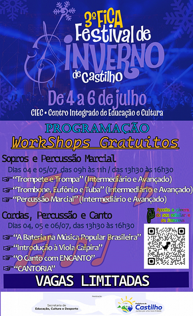 A Secretaria de Educação, Cultura e Desporto divulgou a programação final da tão esperada 3ª edição do FICA – Festival de Inverno de Castilho, que neste ano de 2024, acontecerá entre os dias 04 e 06 de julho, no Anfiteatro do CIEC. O Festival é a maior iniciativa do Governo Municipal para divulgar, revelar talentos e facilitar o acesso popular às expressões artísticas disponíveis em suas Oficinas Culturais e Projeto Guri.