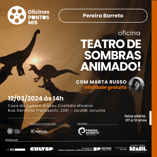 O Departamento de Cultura de Pereira Barreto, através do Pontos Mis, apresentará nesta terça-feira (12), na Casa da Cultura, às 14 horas, a oficina Teatro de Sombras Animado, com Marta Russo. A faixa etária é de 7 a 12 anos. Na apresentação, os participantes irão criar uma história que será narrada através de personagens e cenários feitos em silhueta (papel preto) como em um teatro de sombras, a história será animada na técnica stop-motion e o resultado será um filme de animação de sombras.