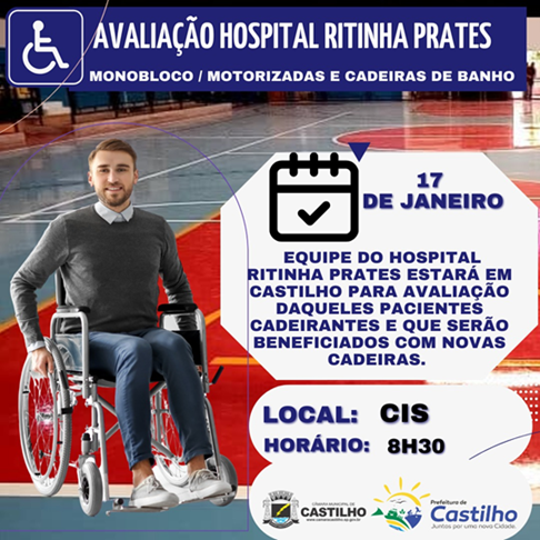 No dia 17 de janeiro, sexta-feira da próxima semana, uma equipe técnica do Hospital Ritinha Prates estará mais uma vez em Castilho para avaliar pacientes que serão beneficiados com novas cadeiras de rodas. A pedido do prefeito Paulo Duarte Boaventura, a Secretaria Municipal de Saúde já fez levantamento prévio dos moradores com mobilidade reduzida ou comprometida e que necessitam desse equipamento de locomoção e elencou 52 pessoas que se enquadram nestes critérios.