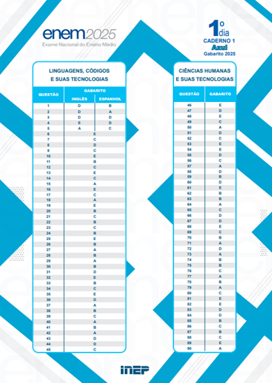 O Instituto Nacional de Estudos e Pesquisas Educacionais Anísio Teixeira (Inep) divulgou, na tarde desta quinta-feira (13), os gabaritos oficiais das provas objetivas do primeiro dia do Exame Nacional do Ensino Médio (Enem) 2025, conforme os cadernos de provas dos candidatos.