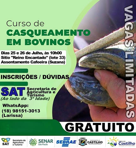 A Secretaria de Agricultura de Castilho anunciou nesta terça-feira (11) a abertura das inscrições para mais um curso de qualificação dos pequenos pecuaristas castilhenses. Desta vez, o treinamento será para o casqueamento correto em bovinos. A exemplo do anunciado ontem, esse também é realizado pelo Governo de Castilho em parceria com o SENAR e o SEBRAE, de forma totalmente gratuita e destinado a pecuaristas maiores de 18 anos e que tenham cursado pelo menos o 4º ano do 1º grau.