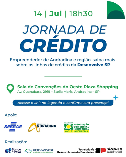 Pra você que já é empreendedor em Andradina e região, tem CNPJ ou sonha em montar o seu negócio, a sua hora é agora! Dia 14 de julho a Desenvolve SP e o Banco do Povo Paulista vão apresentar suas linhas de crédito para Microempreendedores Individuais, micros, pequenos e médios empresários, a partir das 18h30, na Sala de Convenções do Oeste Plaza Shopping, na Avenida Guanabara, 2919, no bairro Stella Maris.
