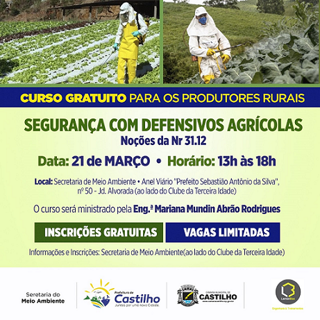 A Secretaria Municipal de Meio Ambiente firmou importante parceria com a empresa Lemon Box visando capacitar os produtores rurais castilhenses no manuseio correto de defensivos agrícolas. O curso gratuito será realizado no dia 21 de março, na própria sede da Secretaria, localizada no Anel Viário “Prefeito Sebastião Antônio da Silva” (ao lado da 3ª Idade).