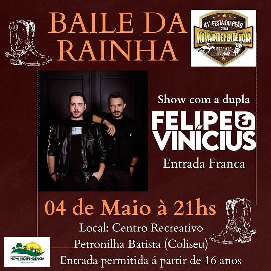 No próximo sábado (04/05), às 21h será realizado o tradicional baile para a escolha da “Rainha” da 41ª Festa do Peão de Nova Independência, que acontecerá dos dias 16 a 19 de maio. O baile para maiores de 16 anos, será realizado no Centro Recreativo Petronila Batista da Silva (Coliseu), com show da dupla Felipe & Vinicius. Além da rainha do rodeio, também serão selecionadas as princesas da festividade.