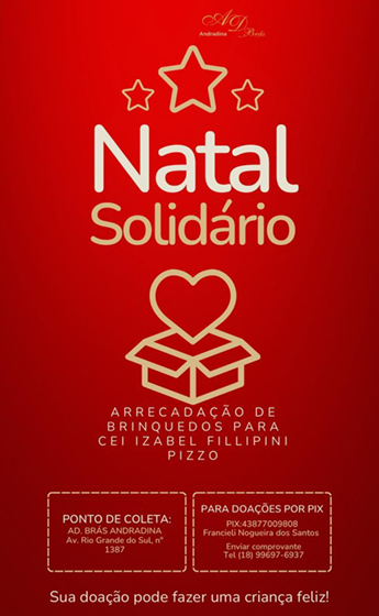 Quem tiver interesse em realizar as doações de brinquedos, poderão fazer no ponto de entrega, na avenida Rio Grande do Sul, 1387 na Igreja Assembleia de Deus Brás Andradina. Quem preferir fazer a doação de forma financeira, poderá doar para a chave Pix CPF. 438.770.098-08 – Francieli Nogueira dos Santos e enviar o comprovante para o WhasApp (18) 99697-6937.