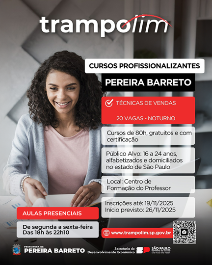 A Prefeitura de Pereira Barreto, em parceria com o Governo do Estado de São Paulo, anunciou a abertura das inscrições para o curso profissionalizante de Técnicas de Vendas, oferecido por meio do programa Trampolim. A iniciativa tem como objetivo capacitar jovens para o mercado de trabalho, promovendo qualificação gratuita e com certificação.