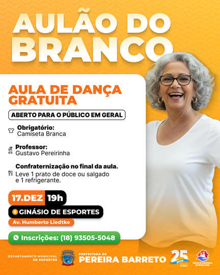 A Prefeitura de Pereira Barreto, por meio do Departamento Municipal de Esportes e do Centro de Convivência da Pessoa Idosa, realizará no dia 17 de dezembro, às 19h, o Aulão do Branco, uma grande aula gratuita de dança aberta ao público em geral. O evento acontecerá no Ginásio de Esportes, localizado na Avenida Humberto Liedtke, e promete movimentar a cidade com muita energia, música e integração.