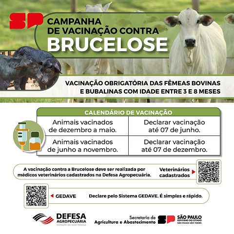 A vacinação contra a Brucelose está em andamento no Estado de São Paulo e os pecuaristas têm até o dia 31 de maio para realizar a imunização das fêmeas bovinas e bubalinas com idade entre três e oito meses. O prazo para declaração da vacina se encerra em 7 de junho no sistema de Gestão de Defesa Animal e Vegetal (GEDAVE), da Coordenadoria de Defesa Agropecuária (CDA) da Secretaria de Agricultura e Abastecimento (SAA).