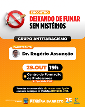 A Prefeitura Municipal de Pereira Barreto, por meio da Secretaria Municipal de Saúde, está promovendo o primeiro encontro do Grupo Antitabagismo, uma iniciativa de apoio multidisciplinar essencial para a saúde pública do município. O primeiro encontro, coordenado pelo Doutor Rogerio Assunção, tem como tema central: “Deixando de fumar sem mistérios”.