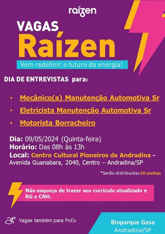 A Raízen faz um mutirão de empregos em Andradina no próximo dia 9 (quinta-feira) no Centro Cultural Pioneiros de Andradina, das 8 às 13 horas. O mutirão é para contratação nas carreiras de Mecânico de Manutenção Automotiva Sênior, Eletricista de Manutenção Automotiva Sênior e Motorista Borracheiro.