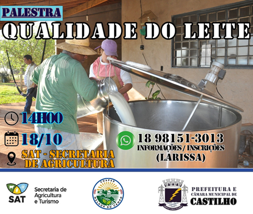 A SAT (Secretaria de Agricultura e Turismo) e a COAPAR (Cooperativa de Produção, Industrialização e Comercialização Agropecuária dos Assentados e Agricultores Familiares da Região Noroeste do Estado de São Paulo). estarão realizando palestra sobre a qualidade do leite. O evento será dia 18 de outubro, na sede sa SAT, no Anel Viário Sebastião Antônio da Silva, 50 – Jd. Alvorada (ao lado do Clube da Terceira Idade).