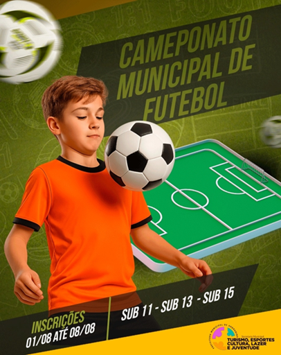 A Secretaria de Turismo, Esportes, Cultura, Lazer e Juventude anuncia a abertura das inscrições para o Campeonato Municipal de Futebol, voltado às categorias de base: Sub-11, Sub-13 e Sub-15. As inscrições estarão abertas no período de 1º a 8 de agosto, e deverão ser realizadas presencialmente no Centro Cultural. A iniciativa busca incentivar a prática esportiva entre crianças e adolescentes do município, promovendo saúde, socialização e espírito de equipe.
