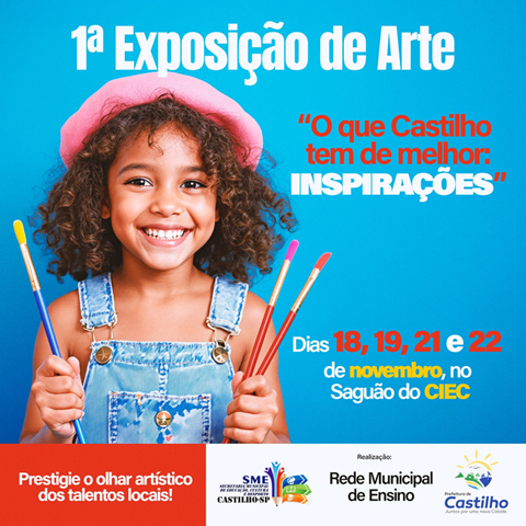 A Secretaria de Educação de Castilho inicia nesta segunda-feira (18), a maior exposição de artes visuais e artesanato produzida por estudantes da rede municipal de ensino. Durante quatro dias inteiros (18, 19, 21 e 22), o saguão principal do CIEC se transforma numa galeria repleta de obras que vão da pintura em tela ao artesanato, passando também pela fotografia e o grafite.