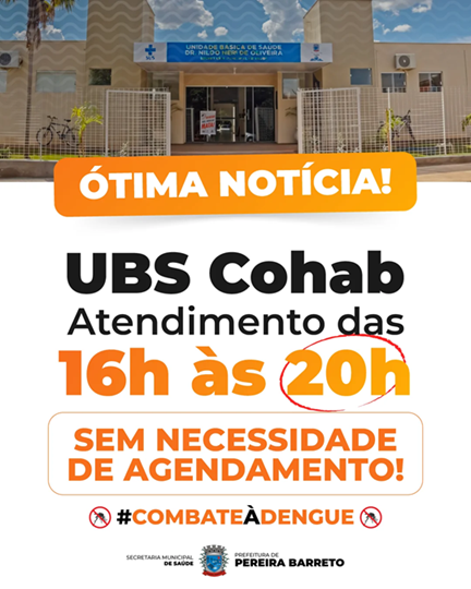Diante do aumento expressivo nos atendimentos espontâneos relacionados as suspeitas de Dengue e outras viroses, a Secretaria Municipal de Saúde anunciou uma medida emergencial para atender à demanda. A partir desta quinta-feira, 9 de janeiro, a UBS Cohab terá seu horário de funcionamento estendido das 16h às 20h, de segunda a sexta-feira.