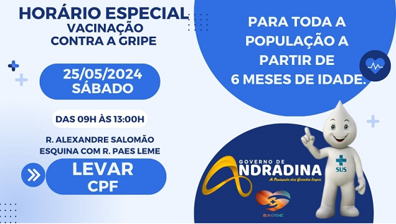 Desta vez o ponto de vacinação estará no cruzamento da Rua Paes Leme com Rua Alexandre Salomão, no coração do Centro Comercial de Andradina. Na semana que vem, nos dias 28 e 29, a vacinação acontece no Oeste Plaza Shopping no mesmo horário. A vacina contra a gripe também está disponível em todas as Unidades Básicas de Saúde de Andradina.