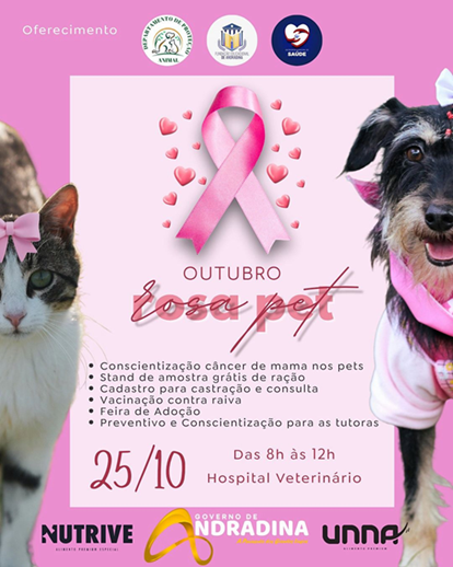 O Departamento da Causa Animal de Andradinal, estará realizando no próximo sábado (25/10) a campanha “Outubro Rosa Pet”. O evento acontecerá das 8h às 12h no Hospital Veterinário de Andradina. Segundo o secretário de Agricultura e Meio Ambiente, Fabrício Mazotti, diversas ações serão desenvolvidas no local com objetivo de promover o bem estar dos pets.