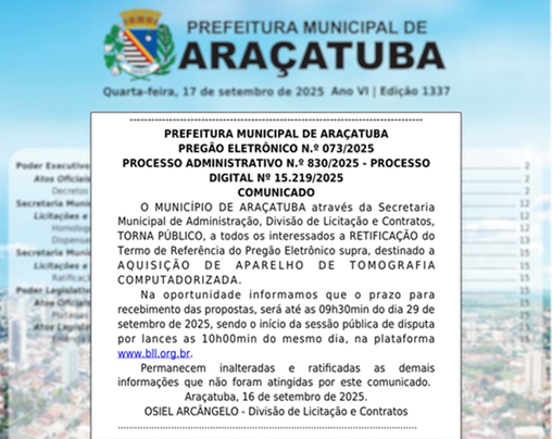 Assessoria de Comunicação A Prefeitura de Araçatuba reabriu nesta quarta-feira (17) a licitação para a compra do primeiro tomógrafo do…