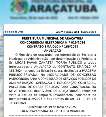 Assessoria de Comunicação A Prefeitura de Araçatuba publicou, nesta terça-feira (20), no Diário Oficial Eletrônico, a anulação do contrato firmado…