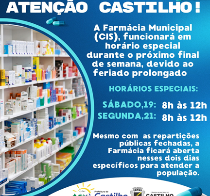 Assessoria de Comunicação A Farmácia Municipal de Castilho, localizada dentro do CIS (Centro Integrado de Saúde), funcionará em horário especial…