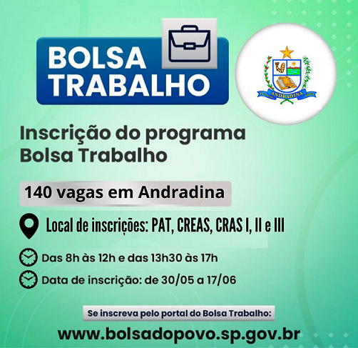 O Governo de Andradina renovou o convênio do Bolsa Trabalho com o Governo do Estado de São Paulo. A cidade foi contemplada com 140 vagas que serão disponibilizadas para moradores de baixa renda. Os critérios são definidos pelo Governo do Estado. Os interessados devem se inscrever no portal do Bolsa do Povo (www.bolsadopovo.sp.gov.br) ou presencialmente no PAT (Posto de Amparo ao Trabalhador), CREAS e CRAS I, II, III do município até 17 de junho.