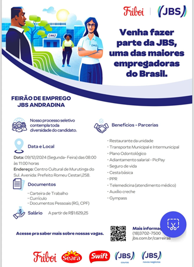 A primeira-dama e secretária de Assistência Social de Murutinga do Sul, Andréa Ribeiro está convidando a população do município que está em busca de emprego, para participar do “feirão de empregos”, em uma parceria entre a administração municipal e o grupo JBS. Os salários são à partir de R$ 1.629,25 e outros benefícios oferecidos pelo frigorífico.