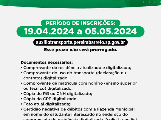 Estão abertas as inscrições para cadastro de estudantes para recebimento do Auxílio Transporte da Prefeitura de Pereira Barreto