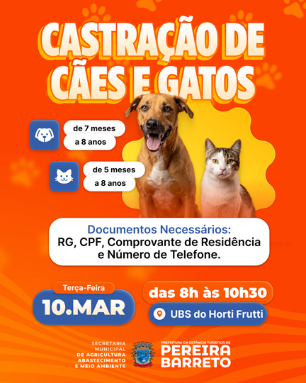 Assessoria de Comunicação A Prefeitura da Estância Turística de Pereira Barreto, por meio da Secretaria Municipal de Agricultura, Abastecimento e Meio Ambiente, realizará uma nova ação de castração gratuita de cães e gatos, voltada aos moradores do município. A iniciativa busca fortalecer as políticas de bem-estar animal, contribuir para o controle populacional de animais e promover […]